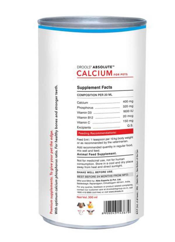Drools Absolute Calcium syrup is a premium supplement that gives your pet the edge. It’s a thick syrup enriched with an optimum amount of calcium and phosphorus to sustain healthy bones and stronger teeth. It is highly palatable and keeps your pet active and agile.