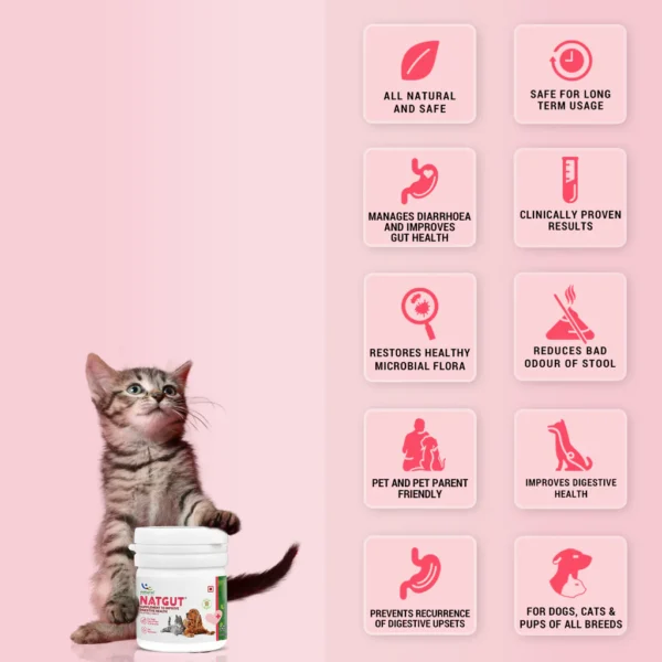 Loose stools, vomiting, bad stool odour, recurring digestive upset — these are signs your pet’s gut needs targeted herbal support. Natgut is a vet-approved, all-natural palatable tablet combining Nutgrass, Kutaj, Pomegranate, Prebiotics & Soluble Fibre to restore healthy gut flora, firm up stools & protect against digestive distress. Safe for daily long-term use. Shop now.