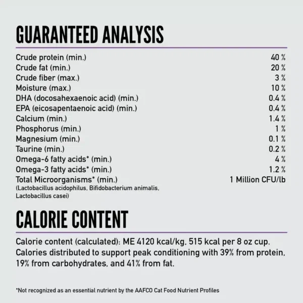 Guaranteed Analysis (Approximate): Crude Protein: Min. 40% Crude Fat: Min. 20% Crude Fibre: Max. 3% Moisture: Max. 10% DHA (Docosahexaenoic Acid): Min. 0.4% EPA (Eicosapentaenoic Acid): Min. 0.4% Taurine: Min. 0.2% Calcium: Min. 1.4% Omega-6 Fatty Acids: Min. 4% Omega-3 Fatty Acids: Min. 1.2% Total Microorganisms (Bacillus Coagulans): Min. 100 Million CFU/lb Metabolisable Energy: Approx. 4120 kcal/kg (approx. 515 kcal per cup) Calorie Distribution: ~39% Protein | ~17% Carbohydrates | ~44% Fat