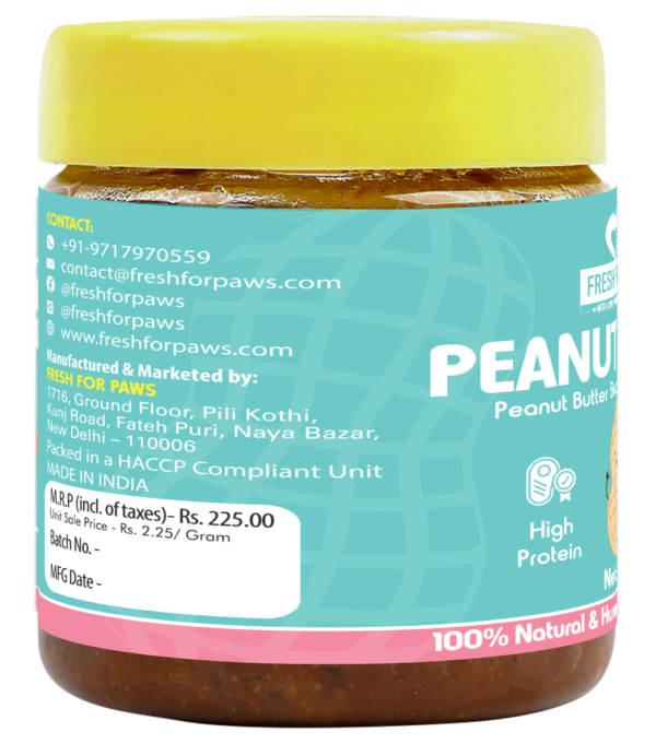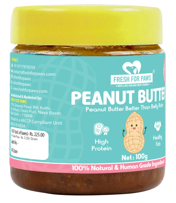 Our Peanut Butter has been a favourite of our furry friends since we started. This yummy jar of Fresh For Paws’ Peanut Butter is HIGH in PROTEIN & filled with HEATHY FATS. It contains VITAMINS A, B6, C, D and E along with minerals – NIACIN, POTASSIUM, ZINC, IRON, MAGNESIUM, CALCIUM, MANGANESE, COPPER and PHOSPHOROUS. Our star treat has ANTI- INFLAMMATORY, ANTIMICROBIAL& ANTI- FUNGAL properties and helps contribute towards a HEALTHY COAT & SKIN. It also improves DIGESTION, IMMUNE SYSTEM and increases ENERGY LEVELS. Our Peanut Butter contains NO CHOLESTEROL & NO XYLITOL. Fresh For Paws’ Peanut Butter not only is great in taste but offers a numerous benefits for dogs.