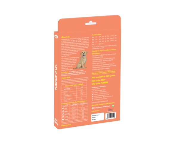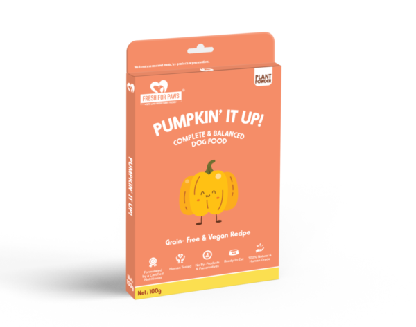 As the name suggests Pumpkin’ It Up is filled with the goodness of Pumpkin and other ingredients – Green Lentils, Chickpeas, Squash, Kale, Quinoa, Spinach, Hemp Oil, Pumpkin Seeds, Basil & Stock. It is a GRAIN- FREE and our last VEGAN recipe. Packed with Vitamin A, B1, B6, C, E & K and Minerals – IRON, POTASSIUM, CALCIUM, & MAGNESIUM. It is HIGHLY DIGESTIBLE, full of PLANT PROTEIN, FIBRE, LOW on FAT and CALORIES. The high WATER CONTENT in Pumpkin & Squash also contributes to SUPPLE SKIN and a LUSTROUS COAT. All these ingredients help develop STRONGER MUSCLES, KIDNEYS, NERVES & HEALTHY HEART and BRAIN. It supports VISION and COLON HEALTH, LIVER DETOXIFICATION, and fight off INFECTIONS. It’s rich in BETA- CAROTENE, OMEGA 3 & 6 and ANTIOXIDANTS. It has a PERFECT BALANCE of OMEGAS 3, 6 & 9.