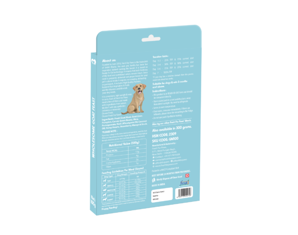 As the name says, it’s a FEAST! it is a COMPLETE & BALANCED meal and It is GRAIN- FREE. Our Meal is HIGH in PROTEIN and LOW in CALORIES. It contains a decent amount of OMEGA-3 & 6 FATTY ACIDS, which help REDUCE INFLAMMATION and keep the pup as STRONG as they can be. It is rich in FOLIC ACID and ESSENTIAL FATTY ACIDS that will ensure the overall WELL BEING of the dog. It has VITAMIN A, Bs, C, E, K, BETA- CAROTENE and Minerals – IRON, POTASSIUM, CALCIUM and MAGNESIUM which supports HEALTHY METABOLISM, SUPPLE SKIN & COAT, IMMUNE SYSTEM, NERVES, MUSCLES, BONES, Our recipe is HIGHLY DIGESTIBLE because of FIBRE rich vegetables. It has an overall I patch on the DIGESTIVE and GUT HEALTH. It is ANTI- INFLAMMATORY and contains ANTIOXIDANTS that help prevent many types of ILLNESSES including cancer. It also helps prevent CELLULAR DAMAGE and eases ARTHRITIS PAIN and fight against ALLERGIES, ASTHMA and INFLAMMATORY DISEASES. It boosts ENERGY LEVELS as well. Our Feast has Fresh Goat Meat, Goat Liver, Pumpkin, Carrot, Green Beans, Okra, Pomegranate, Basil, Hemp Hearts, Strawberries, Mango and Stock cooked in Wheatgerm and Coconut Oil. It is suitable for Cats as well.